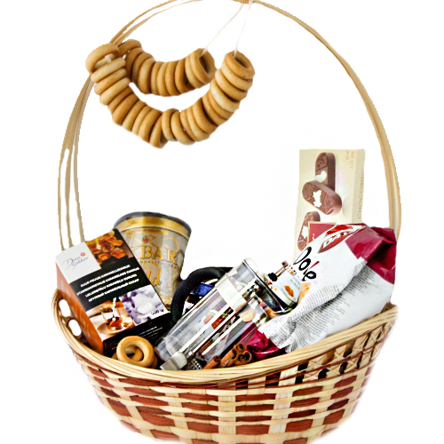 Состав: корзина лодочка, круасаны, печенье, конфитюр, чай, сахар, 2 чашки с блюдцем. френч -прес, декор