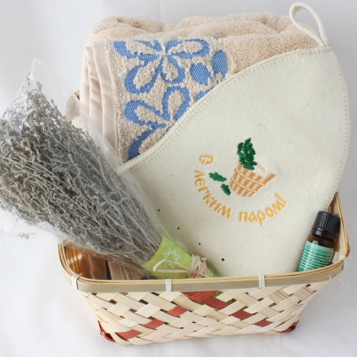Состав: лукошко без ручки - полотенце, веник, арома масло 1шт , шапка для бани