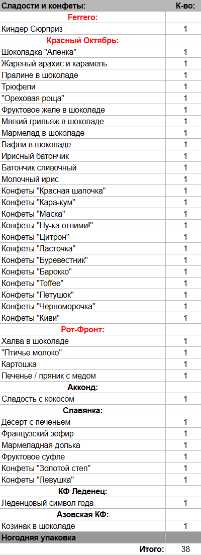 Кол-во сладостей: 38 шт.